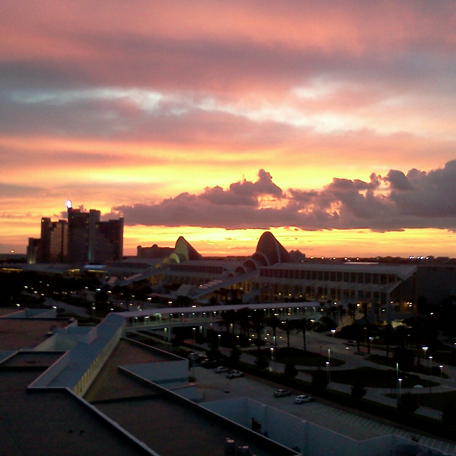 Sunset at the Hilton Orlando overlooking the nearby Orange County Convention Center.