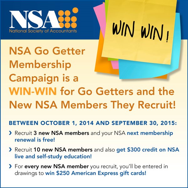 To qualify, each new member you recruit must pay at least $179 in NSA membership dues and must not have been a member of NSA for at least one-year. NSA members recruited at the IRS Tax Forums are excluded from this program.